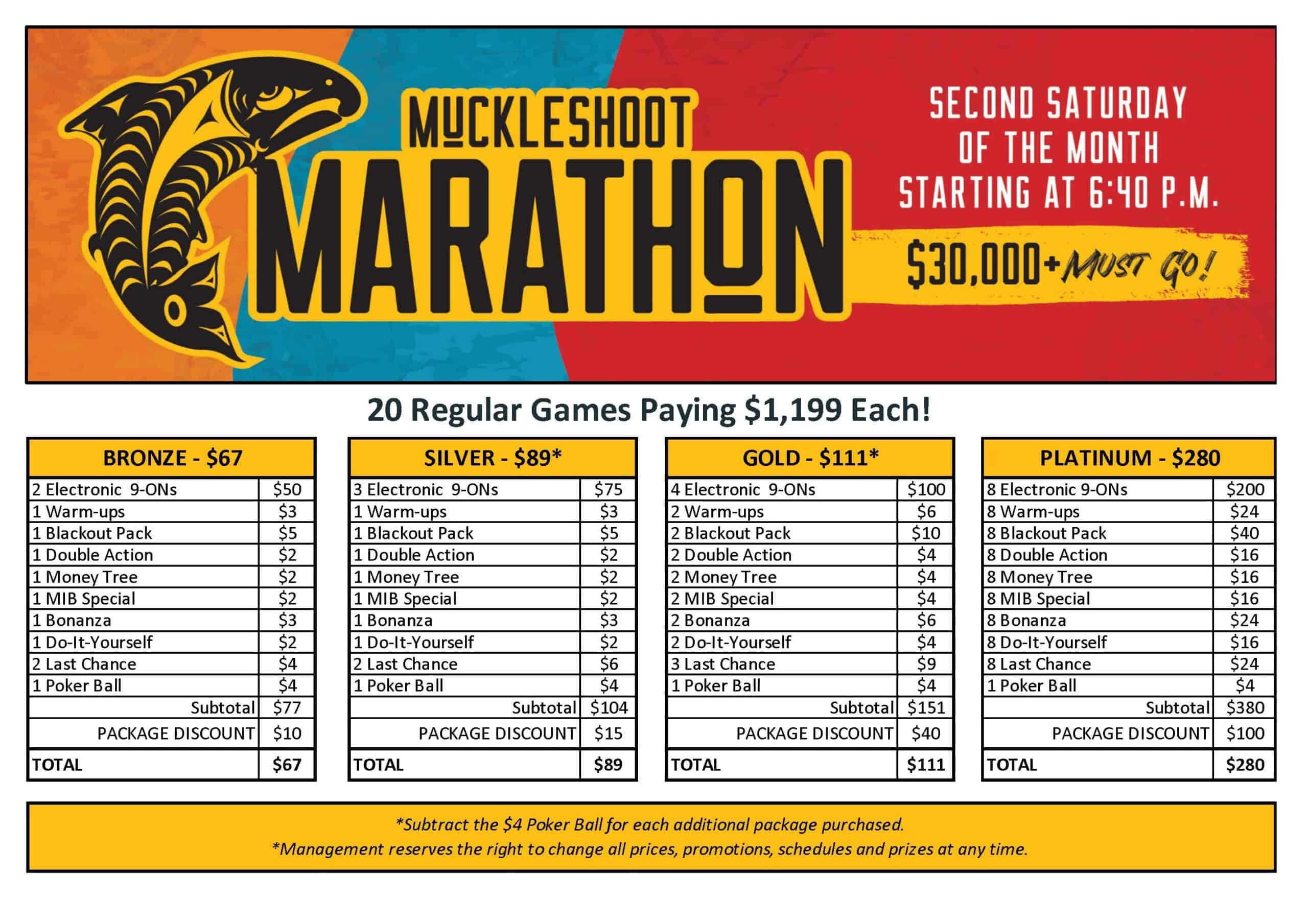 Join us for our monthly Muckleshoot Bingo Marathon and win your share of more than $30,000 in payouts! Starting at 6:40pm on the second Saturday of every month, we’ll play 20 Regular Games paying $1,199 each, PLUS we’ll do three (3) Hot Seat Drawings for $500 Cash!!!
